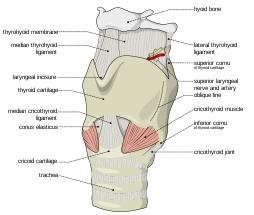 The larynx commonly called the voice box is an organ in the neck of humans involved in breathing, sound production, and protecting the trachea against food aspiration. It manipulates pitch and volume. The larynx houses the vocal folds (commonly but improperly termed the "vocal cords"), which are essential for phonation. The vocal folds are situated just below where the tract of the pharynx splits into the trachea (air pipe) and the esophagus (food pipe).
